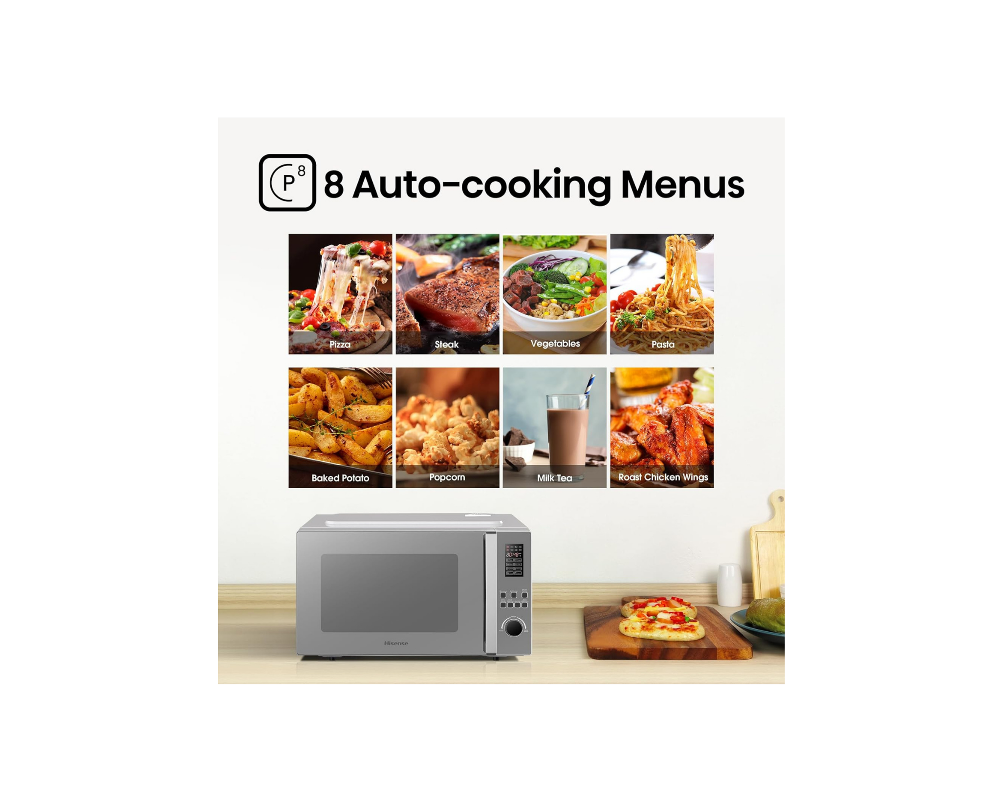 Menús Automáticos: 8 programas preestablecidos (Palomitas, papa, pizza, vegetales congelados, bebidas, plato de cena).